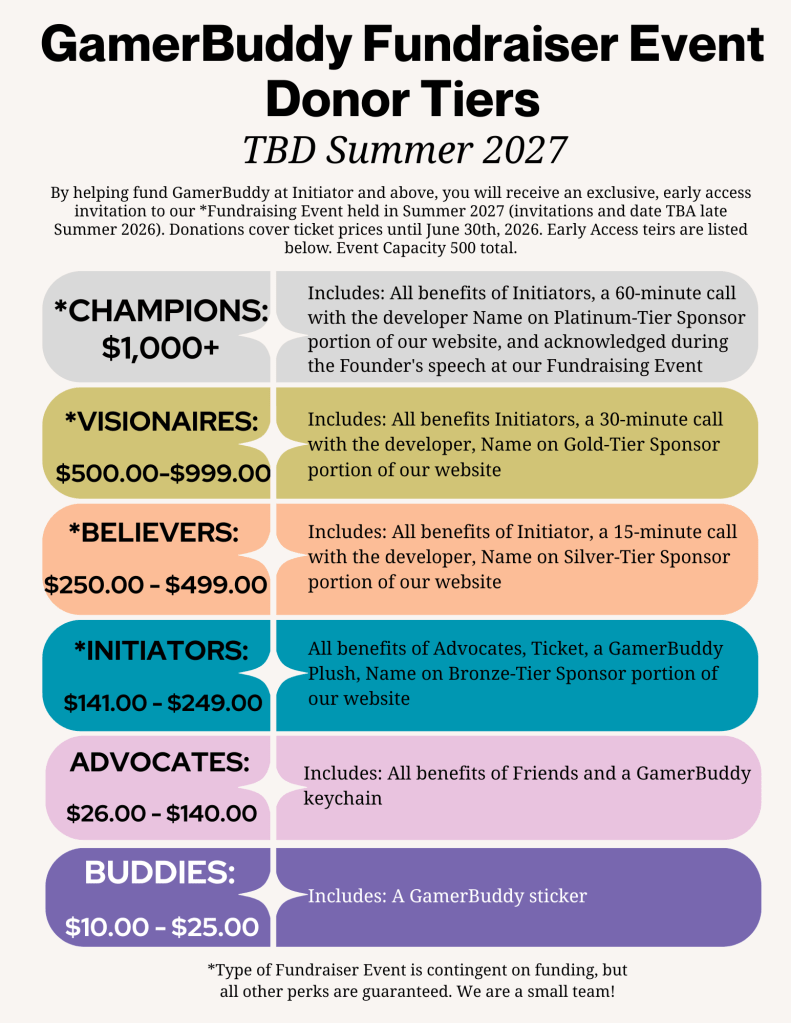 We’re a small team trying to achieve bring dreams, and we cannot do it without you! If you’re able, please consider donating to the development of GamerBuddy. Every small contribution counts, and we appreciate any help we can get. As a perk for donating, we’ve created some perks to help get the GamerBuddy ball rolling (see below for tiers and perks)!